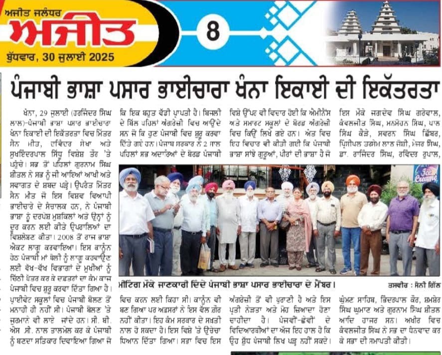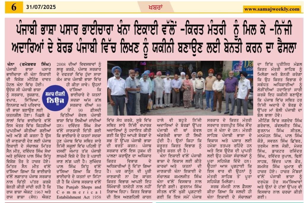 28 ਜੁਲਾਈ 2025 ਨੂੰ ਪੰਜਾਬੀ ਭਾਸ਼ਾ ਪਸਾਰ ਭਾਈਚਾਰਾ ਦੀ ਖੰਨਾ ਇਕਾਈ ਦੀ ਵਿਸ਼ੇਸ਼ ਮੀਟਿੰਗ ਦਾਵਤ ਹੋਟਲ ਖੰਨਾ ਵਿੱਚ ਹੋਈ। ਉਦੇਸ਼ ਸੀ ਪੰਜਾਬੀ ਭਾਸ਼ਾ ਨੂੰ ਸਰਕਾਰ, ਰੁਜ਼ਗਾਰ, ਵਪਾਰ, ਸਿੱਖਿਆ, ਇਨਸਾਫ਼ ਅਤੇ ਪਰਿਵਾਰ ਦੀ ਭਾਸ਼ਾ ਬਣਾਉਣ ਲਈ ਯਤਨਸ਼ੀਲ ਹੋਣਾ। ਪਿਛਲੇ ਛੇ ਸਾਲਾਂ ਵਿੱਚ ਭਾਈਚਾਰੇ ਵੱਲੋਂ ਇਸ ਖੇਤਰ ਵਿੱਚ ਕਿਹੜੀਆਂ ਪ੍ਰਾਪਤੀਆਂ ਕੀਤੀਆਂ ਗਈਆਂ ਅਤੇ ਅੱਗੇ ਕੀ ਕਰਨਾ ਹੈ ਉਸ ਦੀ ਜਾਣਕਾਰੀ ਦੇਣ ਲਈ ਪੰਜਾਬ ਇਕਾਈ ਦੇ ਸੰਚਾਲਕ ਮਿੱਤਰ ਸੈਨ ਮੀਤ, ਦਵਿੰਦਰ ਸਿੰਘ ਸੇਖਾ ਅਤੇ ਸੁਖਿੰਦਰ ਪਾਲ ਸਿੰਘ ਸਿੱਧੂ ਵਿਸ਼ੇਸ਼ ਤੌਰ ਤੇ ਹਾਜ਼ਰ ਹੋਏ। ਮਿੱਤਰ ਸੈਨ ਮੀਤ ਵੱਲੋਂ ਦੱਸਿਆ ਗਿਆ ਕਿ ਭਾਈਚਾਰੇ ਵੱਲੋਂ ਲਗਾਤਾਰ ਪੰਜਾਬ ਸਰਕਾਰ ਨਾਲ ਚਿੱਠੀ ਪੱਤਰ ਕਰਕੇ ਬੇਨਤੀ ਕੀਤੀ ਜਾਂਦੀ ਰਹੀ ਹੈ ਕਿ ਰਾਜ ਭਾਸ਼ਾ ਐਕਟ 1967 ਅਤੇ ਰਾਜ ਭਾਸ਼ਾ (ਸੋਧ) ਐਕਟ 2008 ਦੀਆਂ ਵਿਵਸਥਾਵਾਂ ਨੂੰ ਲਾਗੂ ਕਰਕੇ, ਪੰਜਾਬ ਸਰਕਾਰ ਦੇ ਦਫਤਰਾਂ ਵਿੱਚ ਹੁੰਦਾ ਸਾਰਾ ਕੰਮ ਕਾਜ਼ ਪੰਜਾਬੀ ਭਾਸ਼ਾ ਵਿੱਚ ਹੀ ਕੀਤਾ ਜਾਵੇ। ਉਹਨਾਂ ਦੱਸਿਆ ਕਿ ਭਾਈਚਾਰੇ ਦੇ ਯਤਨਾਂ ਸਦਕਾ ਅੱਜ ਕੱਲ ਸਰਕਾਰ ਦੀਆਂ 80 ਤੋਂ 90 ਫ਼ੀਸਦੀ ਚਿੱਠੀਆਂ ਕੇਵਲ ਪੰਜਾਬੀ ਭਾਸ਼ਾ ਵਿੱਚ ਲਿਖੀਆਂ ਜਾਂਦੀਆਂ ਹਨ। ਦਵਿੰਦਰ ਸਿੰਘ ਸੇਖਾ ਵੱਲੋਂ ਜਾਣਕਾਰੀ ਦਿੱਤੀ ਗਈ ਕਿ ਭਾਈਚਾਰੇ ਦੇ ਯਤਨਾਂ ਸਦਕਾ ਹੁਣ ਪੰਜਾਬ ਵਿੱਚ ਸਥਿਤ ਸਾਰੇ ਨਿੱਜੀ ਸਕੂਲਾਂ ਵਿੱਚ ਪਹਿਲੀ ਤੋਂ ਦਸਵੀਂ ਜਮਾਤ ਤੱਕ ਪੰਜਾਬੀ ਲਾਜ਼ਮੀ ਵਿਸ਼ੇ ਦੇ ਤੌਰ ਤੇ ਪੜਾਈ ਜਾਣ ਲੱਗ ਪਈ ਹੈ। ਸੁਖਿੰਦਰ ਪਾਲ ਸਿੰਘ ਸਿੱਧੂ ਵੱਲੋਂ ਦੱਸਿਆ ਗਿਆ ਕਿ ਇਹ ਭਾਈਚਾਰੇ ਦੇ ਯਤਨਾਂ ਦਾ ਸਿੱਟਾ ਹੀ ਹੈ ਕਿ ਪੰਜਾਬ ਸਰਕਾਰ ਵੱਲੋਂ The Punjab Shops and Commercial Establishment Act 1958 ਵਿੱਚ ਸੋਧ ਕਰਕੇ, ਸੂਬੇ ਵਿੱਚ ਸਥਿਤ ਸਾਰੇ ਨਿੱਜੀ ਵਪਾਰਕ ਅਦਾਰਿਆਂ ਨੂੰ ਹਦਾਇਤ ਕੀਤੀ ਗਈ ਕਿ ਉਹ ਆਪਣੇ ਬੋਰਡਾਂ ਦੇ ਸਭ ਤੋਂ ਉੱਪਰ ਪੰਜਾਬੀ ਭਾਸ਼ਾ ਦੀ ਵਰਤੋਂ ਕਰਨ। ਪੰਜਾਬ ਸਰਕਾਰ ਵੱਲੋਂ ਇਸ ਹੁਕਮ ਦੀ ਪਾਲਣਾ ਕਰਾਉਣ ਦਾ ਅਧਿਕਾਰ ਕਿਰਤ ਵਿਭਾਗ ਦੇ ਅਧਿਕਾਰੀਆਂ ਨੂੰ ਦਿੱਤਾ ਗਿਆ ਹੈ। ਪਰ ਕਾਨੂੰਨ ਦੀ ਪੂਰੀ ਜਾਣਕਾਰੀ ਨਾ ਹੋਣ ਕਾਰਨ ਕਿਰਤ ਵਿਭਾਗ ਆਪਣੀ ਇਹ ਜਿੰਮੇਵਾਰੀ ਤਨਦੇਹੀ ਨਾਲ ਨਹੀਂ ਨਿਭਾਅ ਰਿਹਾ। ਕਿਰਤ ਵਿਭਾਗ ਦੀ ਇਸ ਅਣਗਹਿਲੀ ਕਾਰਨ ਹਾਲੇ ਵੀ ਬਹੁਤੇ ਨਿੱਜੀ ਅਦਾਰਿਆਂ ਦੇ ਬੋਰਡਾਂ ਉੱਪਰ ਪੰਜਾਬੀ ਦੀ ਥਾਂ ਕੇਵਲ ਅੰਗਰੇਜ਼ੀ ਭਾਸ਼ਾ ਹੀ ਲਿਖੀ ਹੁੰਦੀ ਹੈ। ਉਨਾਂ ਕਿਹਾ ਕਿ ਜ਼ਰੂਰਤ ਕਿਰਤ ਵਿਭਾਗ ਨੂੰ ਸੁਚੇਤ ਕਰਨ ਦੀ ਹੈ।