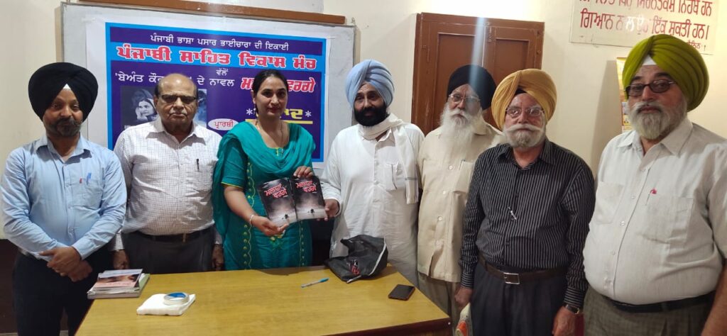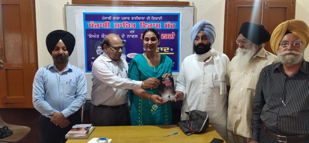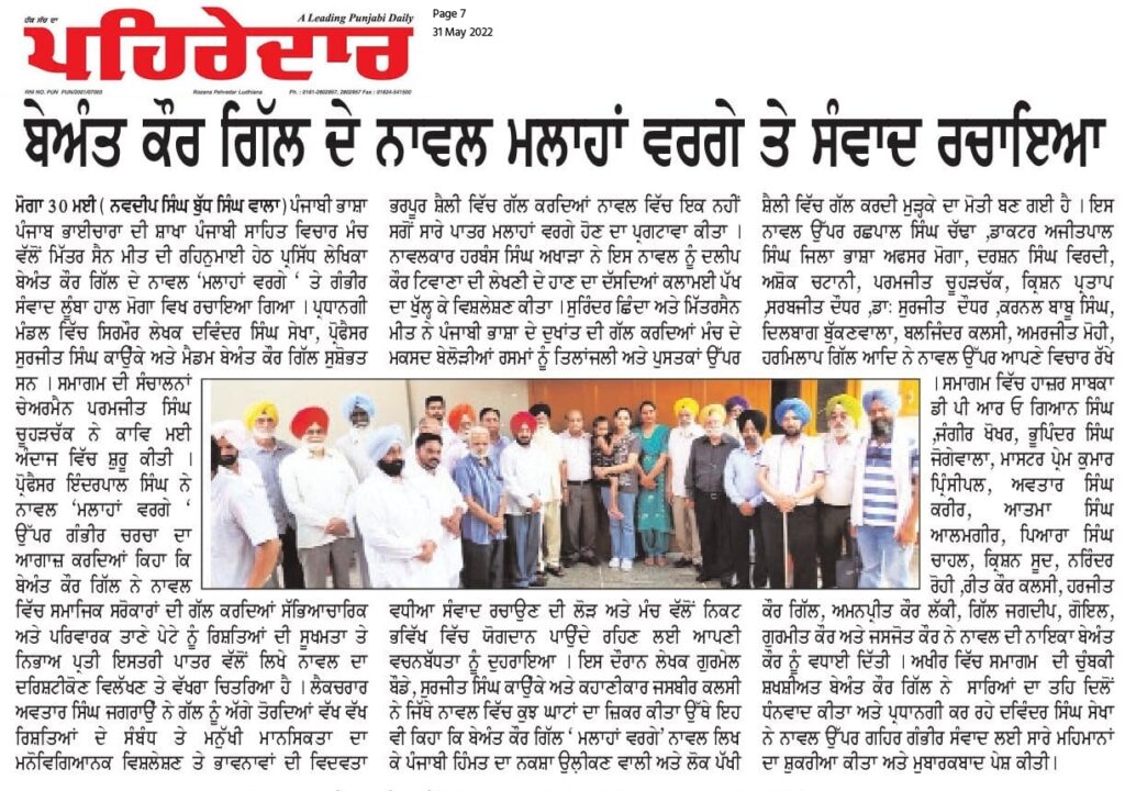 ਬੇਅੰਤ ਕੌਰ ਗਿੱਲ ਆਪਣਾ ਨਾਵਲ ‘ਮਲਾਹਾਂ ਵਰਗੇ’ ਸਾਥੀ ਸਾਹਿਤਕਾਰਾਂ ਦੀ ਨਜ਼ਰ ਕਰਦੇ ਹੋਏ।