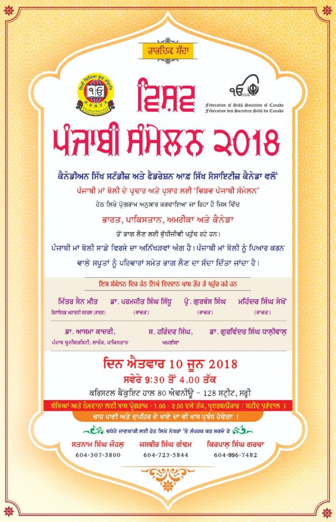 ਪਹਿਲੇ ਵਿਸ਼ਵ ਪੰਜਾਬੀ ਸੰਮੇਲਨ 2018 ਵਿੱਚ ਮਿੱਤਰ ਸੈਨ ਮੀਤ