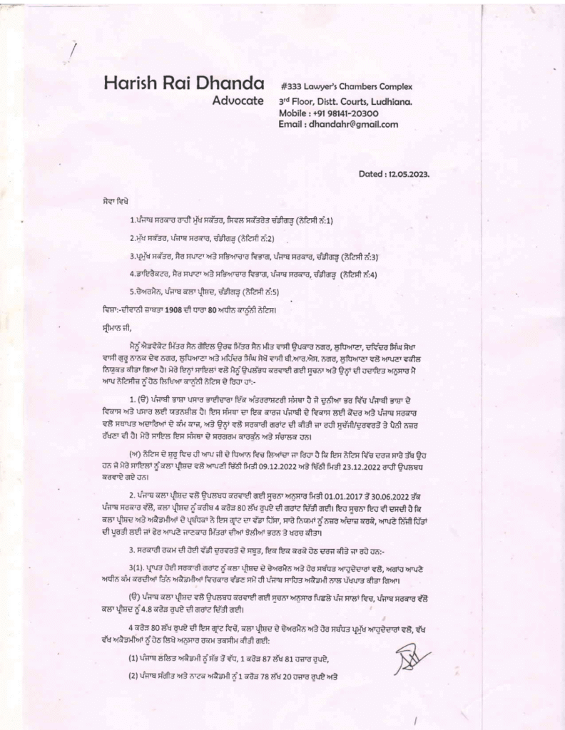12 ਮਈ 2023 ਨੂੰ ਮਿੱਤਰ ਸੈਨ ਮੀਤ, ਦਵਿੰਦਰ ਸਿੰਘ ਸੇਖਾ ਅਤੇ ਮਹਿੰਦਰ ਸਿੰਘ ਸੇਖੋਂ ਵਲੋਂ, ਸ੍ਰੀ ਹਰੀਸ਼ ਰਾਏ ਢਾਂਡਾ ਐਡਵੋਕੇਟ ਲੁਧਿਆਣਾ ਰਾਹੀਂ, ਹੇਠ ਲਿਖੀਆਂ ਮੰਗਾਂ ਨੂੰ ਲੈ ਕੇ ਚੇਅਰਮੈਨ ਪੰਜਾਬ ਕਲਾ ਪ੍ਰੀਸ਼ਦ, ਪੰਜਾਬ ਸਰਕਾਰ ਅਤੇ ਸਬੰਧਤ ਅਧਿਕਾਰੀਆਂ ਨੂੰ ਕਾਨੂੰਨੀ ਨੋਟਿਸ ਦਿੱਤਾ ਗਿਆ: