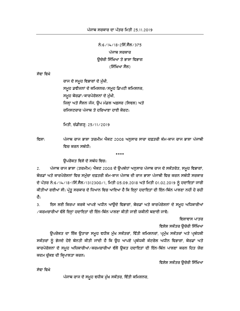 ਪੰਜਾਬ ਸਰਕਾਰ ਆਪਣੇ ਹੁਕਮ ਮਿਤੀ 25.11.2019 ਰਾਹੀਂ ਇਕ ਵਾਰ ਫੇਰ ਪੰਜਾਬ ਰਾਜ ਦੇ ਸਮੂਹ ਵਿਭਾਗਾਂ ਦੇ ਮੁੱਖੀ, ਸਮੂਹ ਡਵੀਜ਼ਨਾਂ ਦੇ ਕਮਿਸ਼ਨਰ/ਸਮੂਹ ਡਿਪਟੀ ਕਮਿਸ਼ਨਰ, ਸਮੂਹ ਵਿਭਾਗਾਂ ਦੇ ਮੁੱਖੀ/ਬੋਰਡਾਂ, ਕਾਰਪੋਰੇਸ਼ਨਾਂ ਦੇ ਮੁੱਖੀ, ਜਿਲ੍ਹਾ ਅਤੇ ਸੈਸ਼ਨ ਜੱਜ, ਉਪ ਮੰਡਲ ਅਫ਼ਸਰ (ਸਿਵਲ) ਅਤੇ ਰਜਿਸਟਰਾਰ, ਪੰਜਾਬ ਤੇ ਹਰਿਆਣਾ ਹਾਈ ਕੋਰਟ ਨੂੰ ਸਾਰਾ ਦਫ਼ਤਰੀ ਕੰਮ-ਕਾਜ ਰਾਜ ਭਾਸ਼ਾ ਪੰਜਾਬੀ ਵਿਚ ਕਰਨ ਦੀ ਹਦਾਇਤ ਕੀਤੀ ਗਈ।