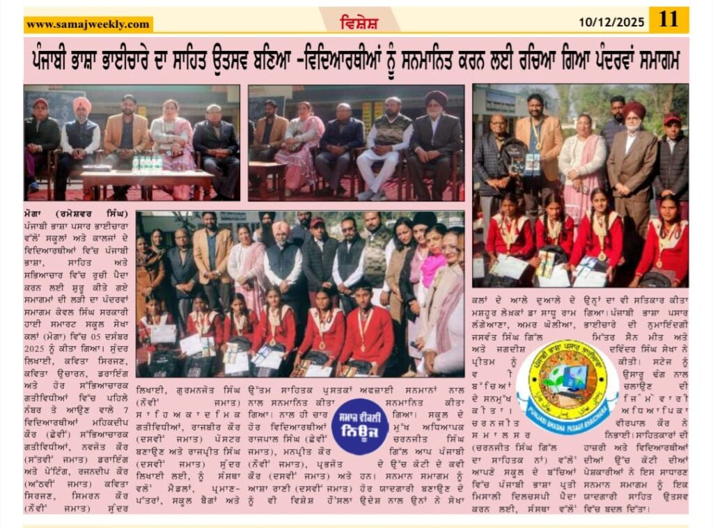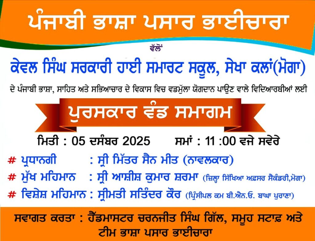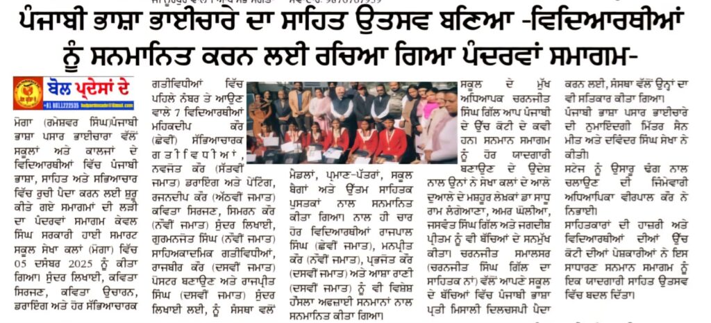 ਪੰਜਾਬੀ ਭਾਸ਼ਾ ਪਸਾਰ ਭਾਈਚਾਰਾ ਵੱਲੋਂ ਸਕੂਲਾਂ ਅਤੇ ਕਾਲਜਾਂ ਦੇ ਵਿਦਿਆਰਥੀਆਂ ਵਿੱਚ ਪੰਜਾਬੀ ਭਾਸ਼ਾ, ਸਾਹਿਤ ਅਤੇ ਸਭਿਆਚਾਰ ਵਿੱਚ ਰੁਚੀ ਪੈਦਾ ਕਰਨ ਲਈ ਸ਼ੁਰੂ ਕੀਤੇ ਗਏ ਸਮਾਗਮਾਂ ਦੀ ਲੜੀ ਦਾ ਪੰਦਰਵਾਂ ਸਮਾਗਮ ਕੇਵਲ ਸਿੰਘ ਸਰਕਾਰੀ ਹਾਈ ਸਮਾਰਟ ਸਕੂਲ ਸੇਖਾ ਕਲਾਂ (ਮੋਗਾ) ਵਿੱਚ 05 ਦਸੰਬਰ 2025 ਨੂੰ ਕੀਤਾ ਗਿਆ। ਸੁੰਦਰ ਲਿਖਾਈ, ਕਵਿਤਾ ਸਿਰਜਣ, ਕਵਿਤਾ ਉਚਾਰਨ, ਡਰਾਇੰਗ ਅਤੇ ਹੋਰ ਸੱਭਿਆਚਾਰਕ ਗਤੀਵਿਧੀਆਂ ਵਿੱਚ ਪਹਿਲੇ ਨੰਬਰ ਤੇ ਆਉਣ ਵਾਲੇ7ਵਿਦਿਆਰਥੀ (ਮਹਿਕਦੀਪ ਕੌਰ (ਛੇਵੀਂ) ਸੱਭਿਆਚਾਰਕ ਗਤੀਵਿਧੀਆਂ, ਨਵਜੋਤ ਕੌਰ (ਸੱਤਵੀਂ ਜਮਾਤ) ਡਰਾਇੰਗ ਅਤੇ ਪੇਂਟਿੰਗ, ਰਜਨਦੀਪ ਕੌਰ (ਅੱਠਵੀਂ ਜਮਾਤ) ਕਵਿਤਾ ਸਿਰਜਣ, ਸਿਮਰਨ ਕੌਰ (ਨੌਵੀਂ ਜਮਾਤ) ਸੁੰਦਰ ਲਿਖਾਈ, ਗੁਰਮਨਜੋਤ ਸਿੰਘ (ਨੌਵੀਂ ਜਮਾਤ) ਸਾਹਿਅਕਾਦਮਿਕ ਗਤੀਵਿਧੀਆਂ, ਰਾਜਬੀਰ ਕੌਰ (ਦਸਵੀਂ ਜਮਾਤ) ਪੋਸਟਰ ਬਣਾਉਣ ਅਤੇ ਰਾਜਪ੍ਰੀਤ ਸਿੰਘ (ਦਸਵੀਂ ਜਮਾਤ) ਸੁੰਦਰ ਲਿਖਾਈ ਲਈ ਨੂੰ ਸੰਸਥਾ ਵਲੋਂ ਮੈਡਲਾਂ, ਪ੍ਰਮਾਣ-ਪੱਤਰਾਂ, ਸਕੂਲ ਬੈਗਾਂ ਅਤੇ ਉੱਤਮ ਸਾਹਿਤਕ ਪੁਸਤਕਾਂ ਨਾਲ ਸਨਮਾਨਿਤ ਕੀਤਾ ਗਿਆ। ਨਾਲ ਹੀ ਚਾਰ ਹੋਰ ਵਿਦਿਆਰਥੀਆਂ (ਰਾਜਪਾਲ ਸਿੰਘ (ਛੇਵੀਂ ਜਮਾਤ), ਮਨਪ੍ਰੀਤ ਕੌਰ (ਨੌਵੀਂ ਜਮਾਤ), ਪ੍ਰਭਜੋਤ ਕੌਰ (ਦਸਵੀਂ ਜਮਾਤ) ਅਤੇ ਆਸ਼ਾ ਰਾਣੀ (ਦਸਵੀਂ ਜਮਾਤ) ਨੂੰ ਵਿਸ਼ੇਸ਼ ਹੌਂਸਲਾ ਅਫਜਾਈ ਸਨਮਾਨ ਨਾਲ ਸਨਮਾਨਿਤ ਕੀਤਾ ਗਿਆ।