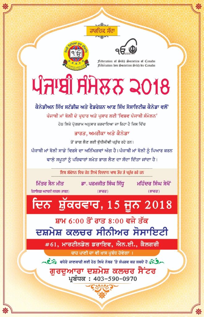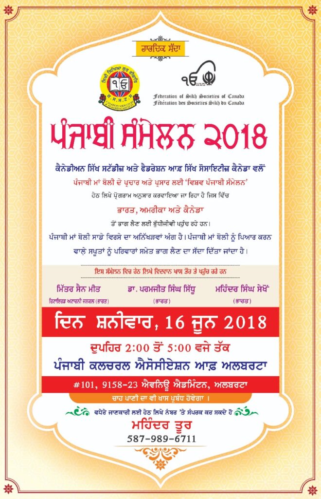 ਸਾਲ 2018 ਵਿੱਚ, ਮਾਂ ਬੋਲੀ ਪੰਜਾਬੀ ਦੇ ਕਨੇਡੀਅਨ ਵਾਰਿਸਾਂ ਵੱਲੋਂ, ਪੰਜਾਬ ਵਿੱਚ ਪੰਜਾਬੀ ਦੇ ਵਿਕਾਸ ਵਿੱਚ ਆਈ ਖੜੋਤ ਨੂੰ ਠੱਲ ਪਾਉਣ ਅਤੇ ਇਸ ਦੇ ਵਿਕਾਸ ਨੂੰ ਰਫਤਾਰ ਦੇਣ ਲਈ ਚਾਰ ਵਿਸ਼ਵ ਪੰਜਾਬੀ ਸੰਮੇਲਨ ਕਰਵਾਏ ਗਏ। ਇੰਨਾ ਸਮਾਗਮਾਂ ਵਿੱਚ ਪੰਜਾਬ ਦੀ ਪ੍ਰਤੀਨਿਧਤਾ ਮਿੱਤਰ ਸੈਨ ਮੀਤ ਅਤੇ ਮਹਿੰਦਰ ਸਿੰਘ ਸੇਖੋਂ ਵੱਲੋਂ ਕੀਤੀ ਗਈ।