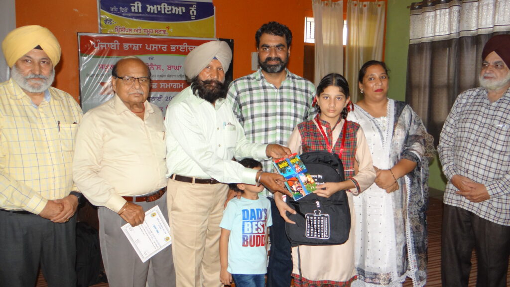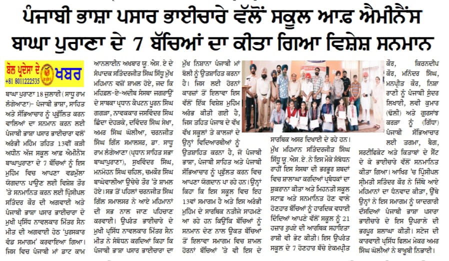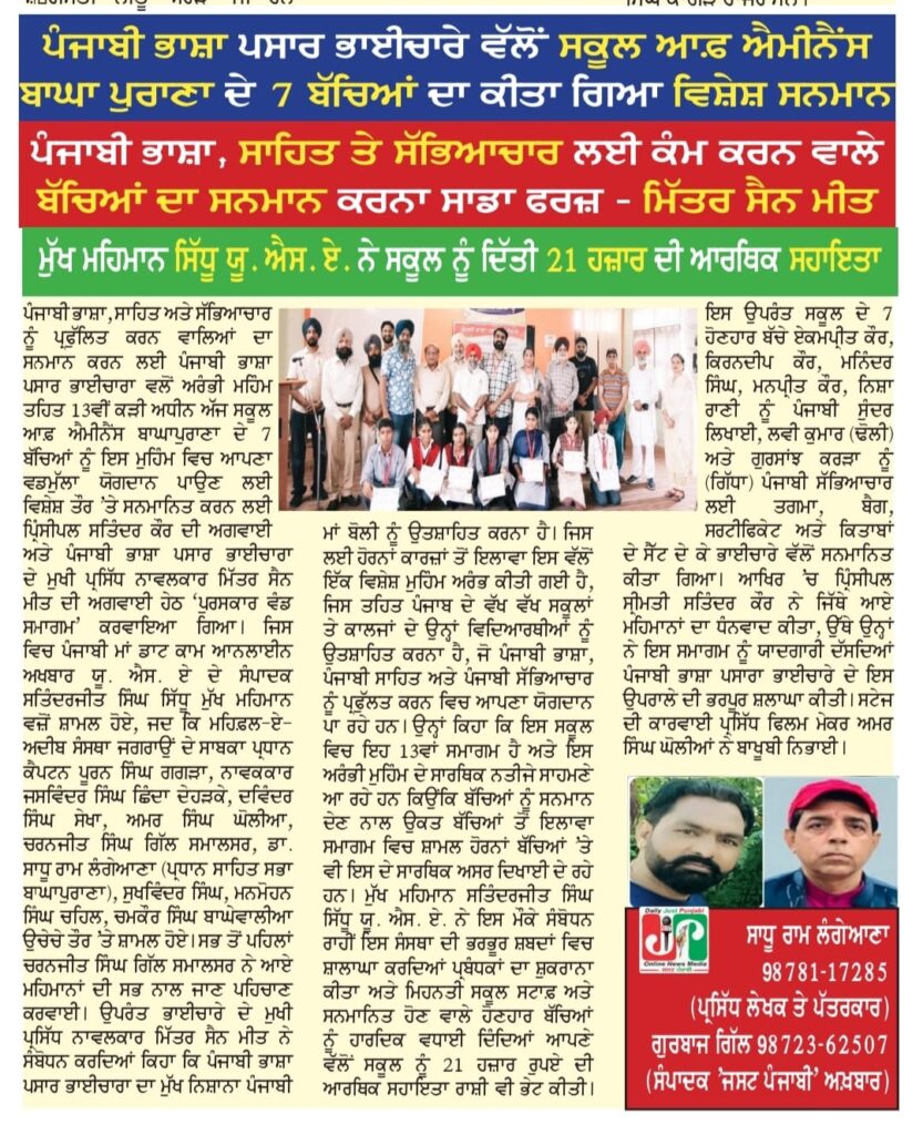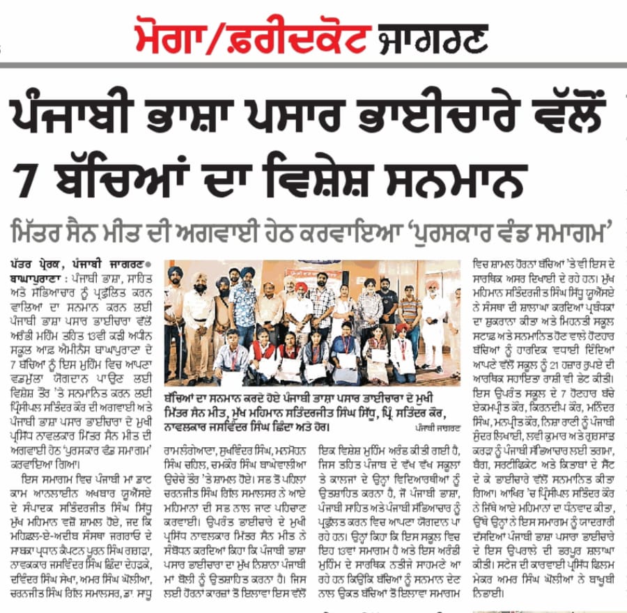 ਪੰਜਾਬੀ ਭਾਸ਼ਾ ਪ੍ਰਸਾਰ ਭਾਈਚਾਰਾ ਵੱਲੋਂ ਸਕੂਲਾਂ ਤੇ ਕਾਲਜਾਂ ਦੇ ਵਿਦਿਆਰਥੀਆਂ ਨੂੰ ਪੰਜਾਬੀ ਭਾਸ਼ਾ ਸਾਹਿਤ ਅਤੇ ਸੱਭਿਆਚਾਰ ਪ੍ਰਤੀ ਪ੍ਰੇਰਿਤ ਕਰਨ ਲਈ ਸ਼ੁਰੂ ਕੀਤੀ ਗਈ ਸਮਾਗਮਾਂ ਦੀ ਲੜੀ ਦਾ ਤੇਰਵਾਂ ਸਮਾਗਮ, 17 ਜੁਲਾਈ 2025 ਨੂੰ, ਸਕੂਲ ਆਫ ਐਮੀਨੈਂਸ ਬਾਘਾ ਪੁਰਾਣਾ ਵਿੱਚ ਕੀਤਾ ਗਿਆ। ਭਾਈਚਾਰਾ ਵੱਲੋਂ, ਇਸ ਸਕੂਲ ਦੇ ਪੰਜਾਬੀ ਸੱਭਿਆਚਾਰ ਦੇ ਵੱਖ-ਵੱਖ ਖੇਤਰਾਂ ( ਜਿਵੇਂ ਢੋਲ, ਸੁੰਦਰ ਲਿਖਾਈ, ਆਰਟ, ਡਰਾਇੰਗ, ਭੰਗੜਾ, ਗਿੱਧਾ ਆਦਿ) ਵਿੱਚ ਵਡਮੁੱਲਾ ਯੋਗਦਾਨ ਪਾਉਣ ਵਾਲੇ ਸੱਤ ਵਿਦਿਆਰਥੀਆਂ (ਏਕਮਪ੍ਰੀਤ ਕੌਰ, ਲਵੀ ਕੁਮਾਰ, ਕਿਰਨਦੀਪ ਕੌਰ, ਮਨਿੰਦਰ ਸਿੰਘ, ਮਨਪ੍ਰੀਤ ਕੌਰ ਨੀਸ਼ਾ ਰਾਣੀ ਅਤੇ ਗੁਰਸਾਂਝ ਕਰੜਾ) ਨੂੰ, ਸਕੂਲ ਬੈਗਾਂ, ਮੈਡਲਾਂ, ਪ੍ਰਮਾਣ ਪੱਤਰਾਂ ਅਤੇ ਪੁਸਤਕਾਂ ਨਾਲ ਸਨਮਾਨਿਤ ਕੀਤਾ ਗਿਆ ਉੱਥੇ ਹੀ ਏਸ ਸਕੂਲ ਵਿੱਚੋਂ 25 ਸਾਲ ਪਹਿਲਾਂ ਤੱਪੜਾਂ ਤੇ ਪੜ੍ਹ ਕੇ ਗਏ ਸ੍ਰ. ਸਤਿੰਦਰਜੀਤ ਸਿੰਘ ਸਿੱਧੂ ਉਰਫ਼ ਸੱਤੀ (ਸਕੂਲ ਦਾ ਨਾਂ) ਨੂੰ ਵੀ ਮੁੱਖ ਮਹਿਮਾਨ ਵਜੋਂ ਬੁਲਾ ਕੇ ਸਨਮਾਨਿਤ ਕੀਤਾ ਗਿਆ।