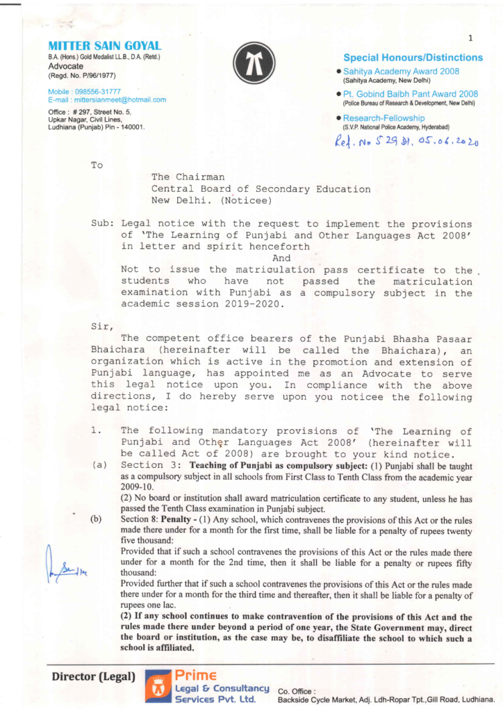 5 ਜੂਨ 2020 ਨੂੰ ਐਡਵੋਕੇਟ ਮਿੱਤਰ ਸੈਨ ਮੀਤ ਵਲੋਂ Chairman Central Board of School Education New Delhi, ਪੰਜਾਬ ਸਰਕਾਰ  ਅਤੇ ਹੋਰ ਉੱਚ ਅਧਿਕਾਰੀਆਂ ਨੂੰ ਹੇਠ ਲਿਖੇ ਵਿਸ਼ੇ ਤੇ ਇਕ ਕਾਨੂੰਨੀ ਨੋਟਿਸ ਭੇਜਿਆ ਗਿਆ;