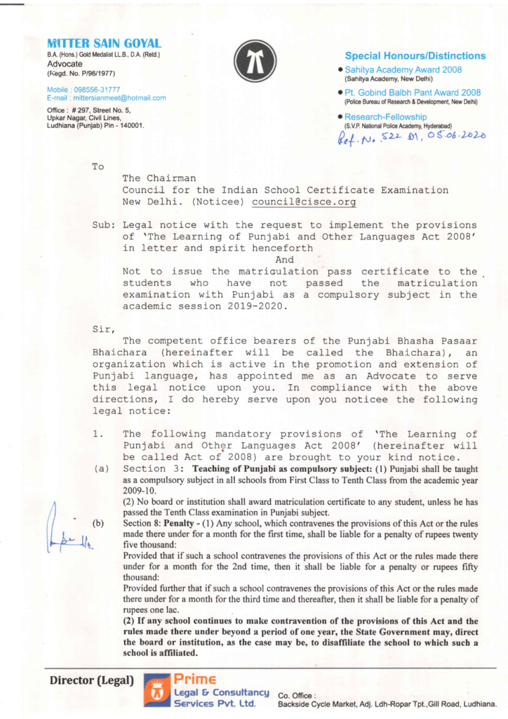 ਇਸੇ ਤਰਾਂ ਜੂਨ 2020 ਨੂੰ ਹੀ ਐਡਵੋਕੇਟ ਮਿੱਤਰ ਸੈਨ ਮੀਤ ਵਲੋਂ Chairman Council for the Indian School Certificate Examination New Delhi, ਪੰਜਾਬ ਸਰਕਾਰ ਅਤੇ ਹੋਰ ਉੱਚ ਅਧਿਕਾਰੀਆਂ ਨੂੰ ਹੇਠ ਲਿਖੇ ਵਿਸ਼ੇ ਤੇ ਇਕ ਕਾਨੂੰਨੀ ਨੋਟਿਸ ਭੇਜਿਆ ਗਿਆ: